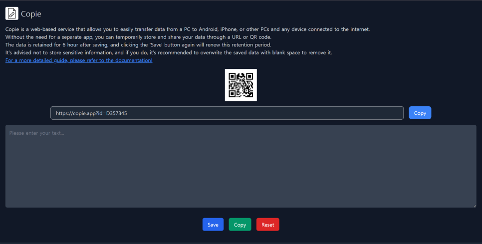 위에 캡처에 있는 것 처럼 사이트에 접속하여 내용을 작성하고 SAVE를 누르고 id가 적혀있는 url을 통해 접근하거나 모바일 기기에서 카메라로 QR코드를 찍으면 바로 해당 페이지로 접근해서 내용을 볼 수 있고 바로 복사가 가능합니다.